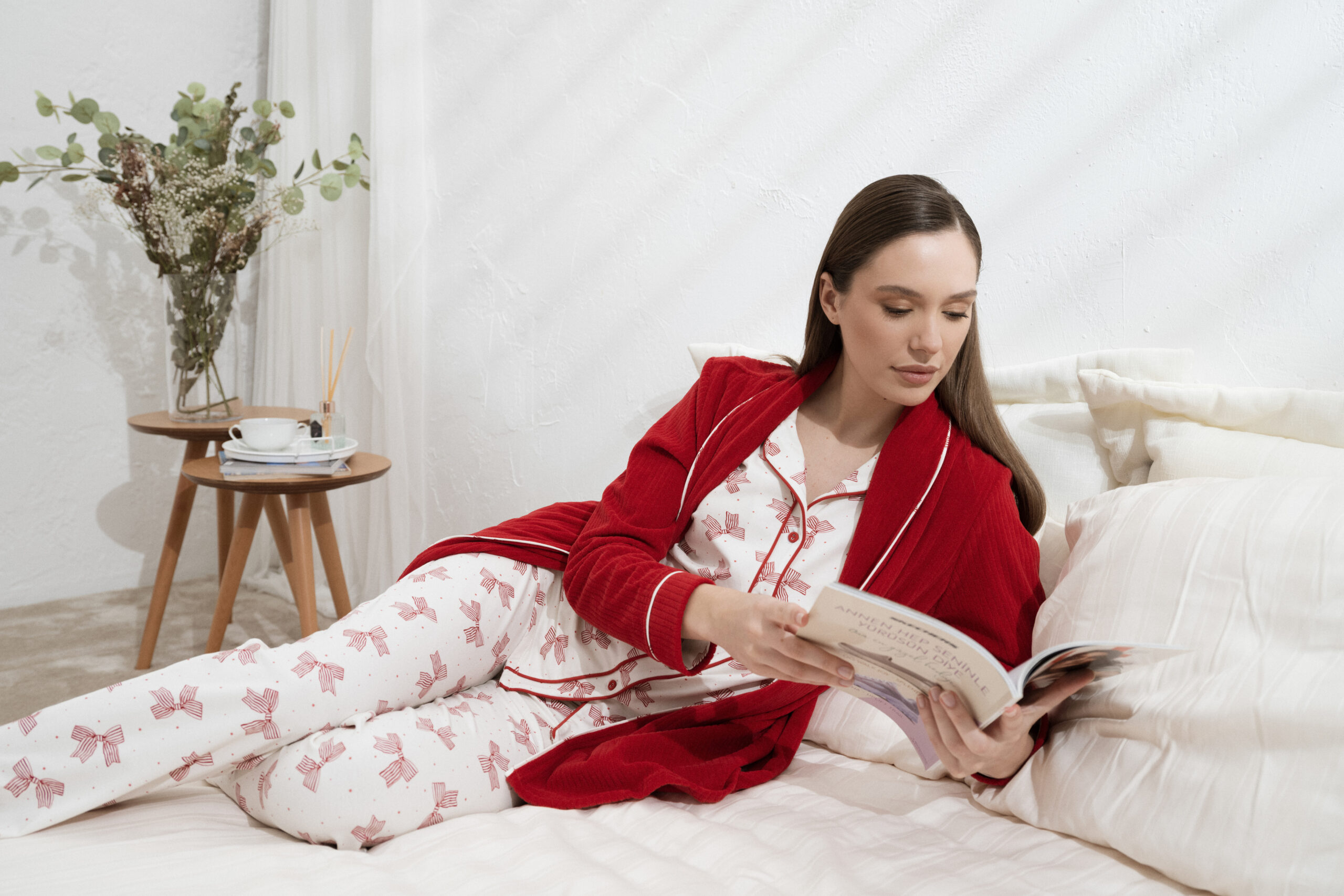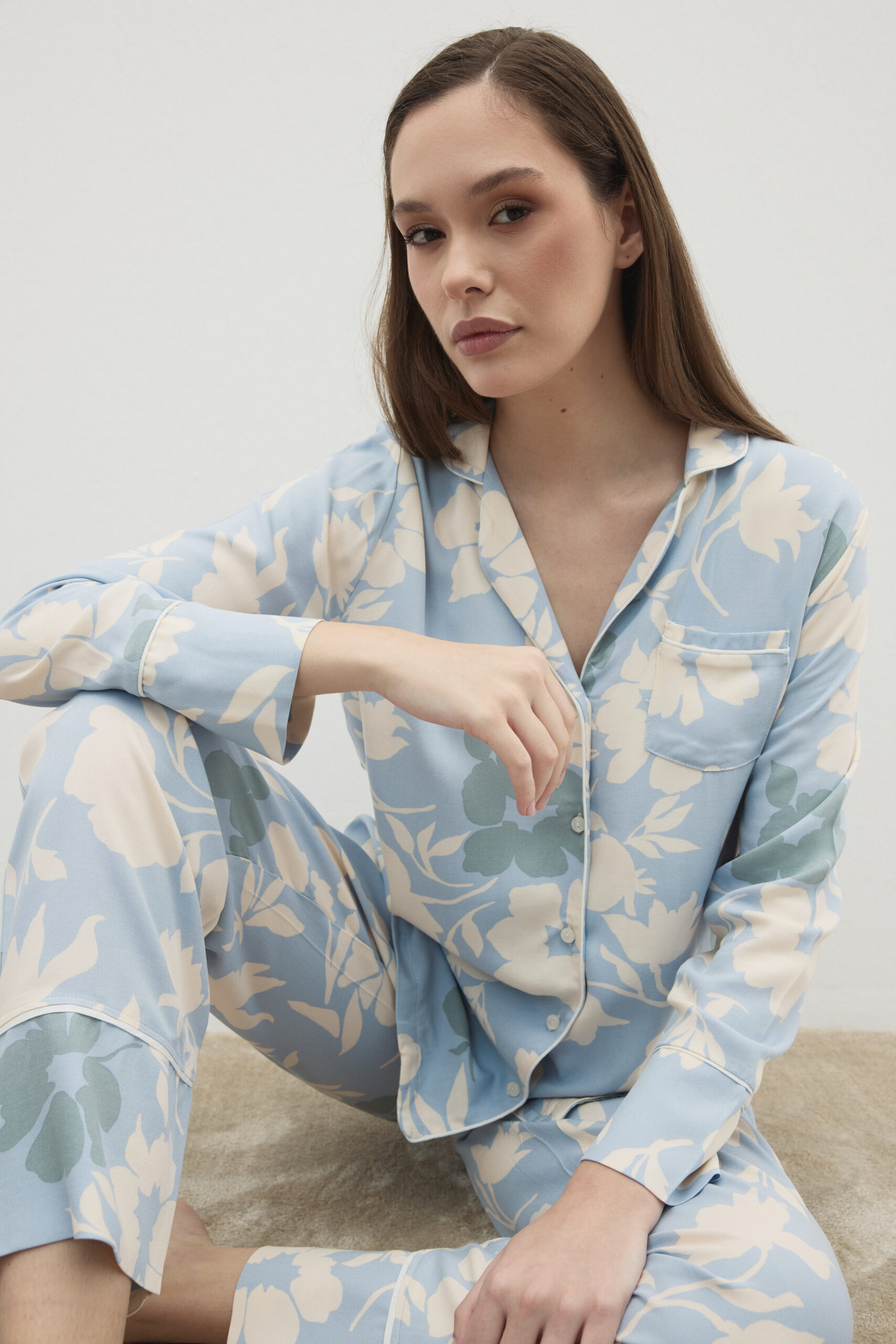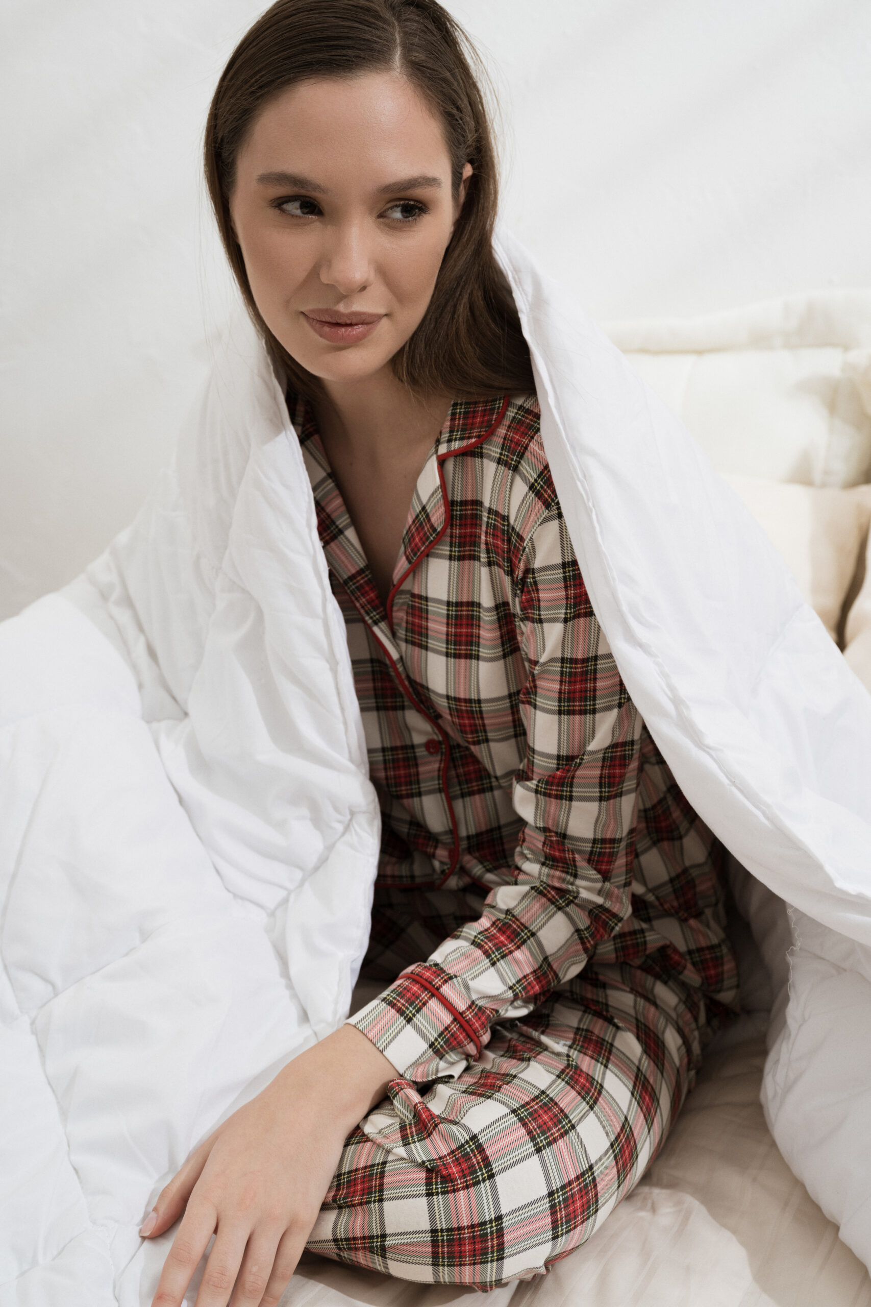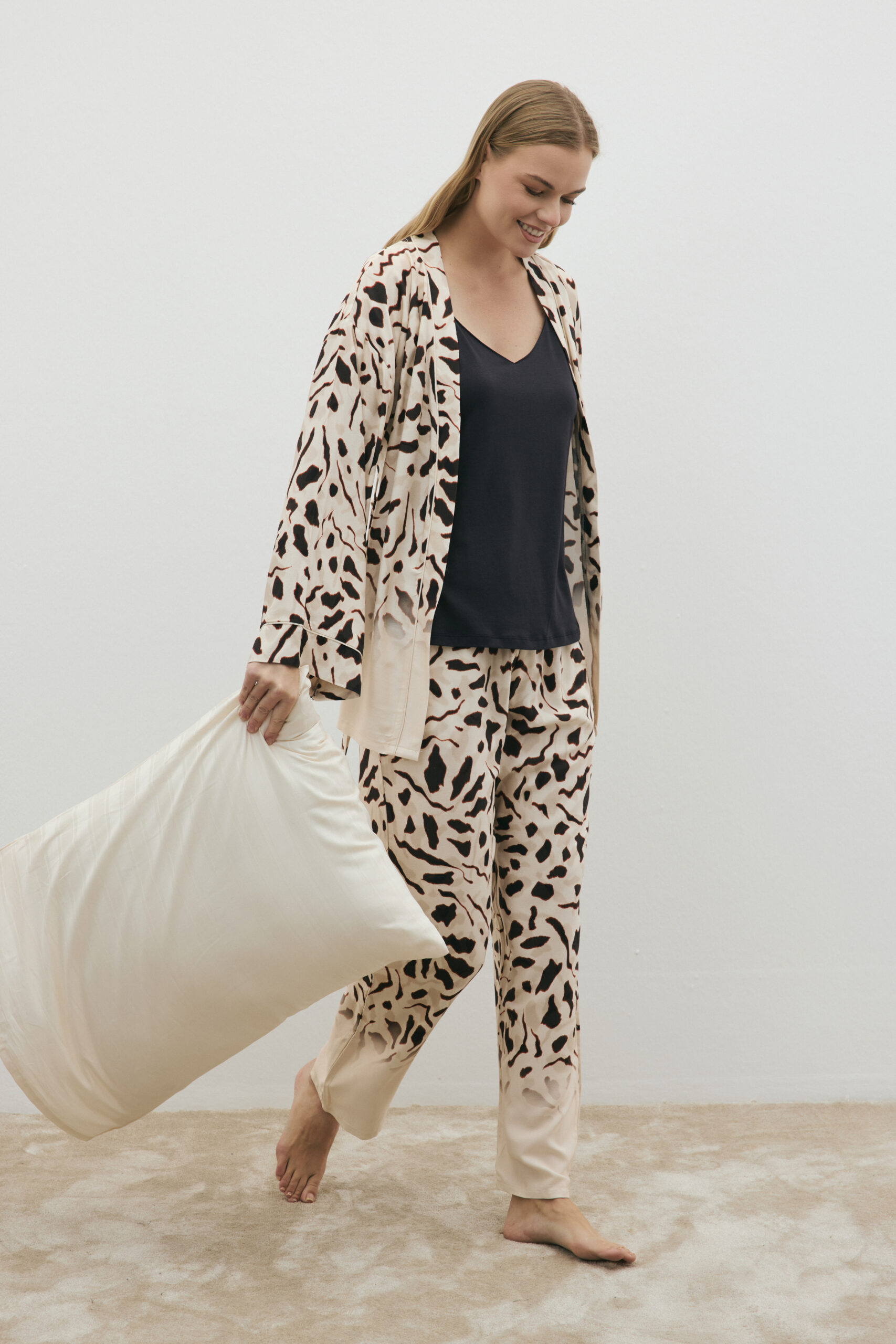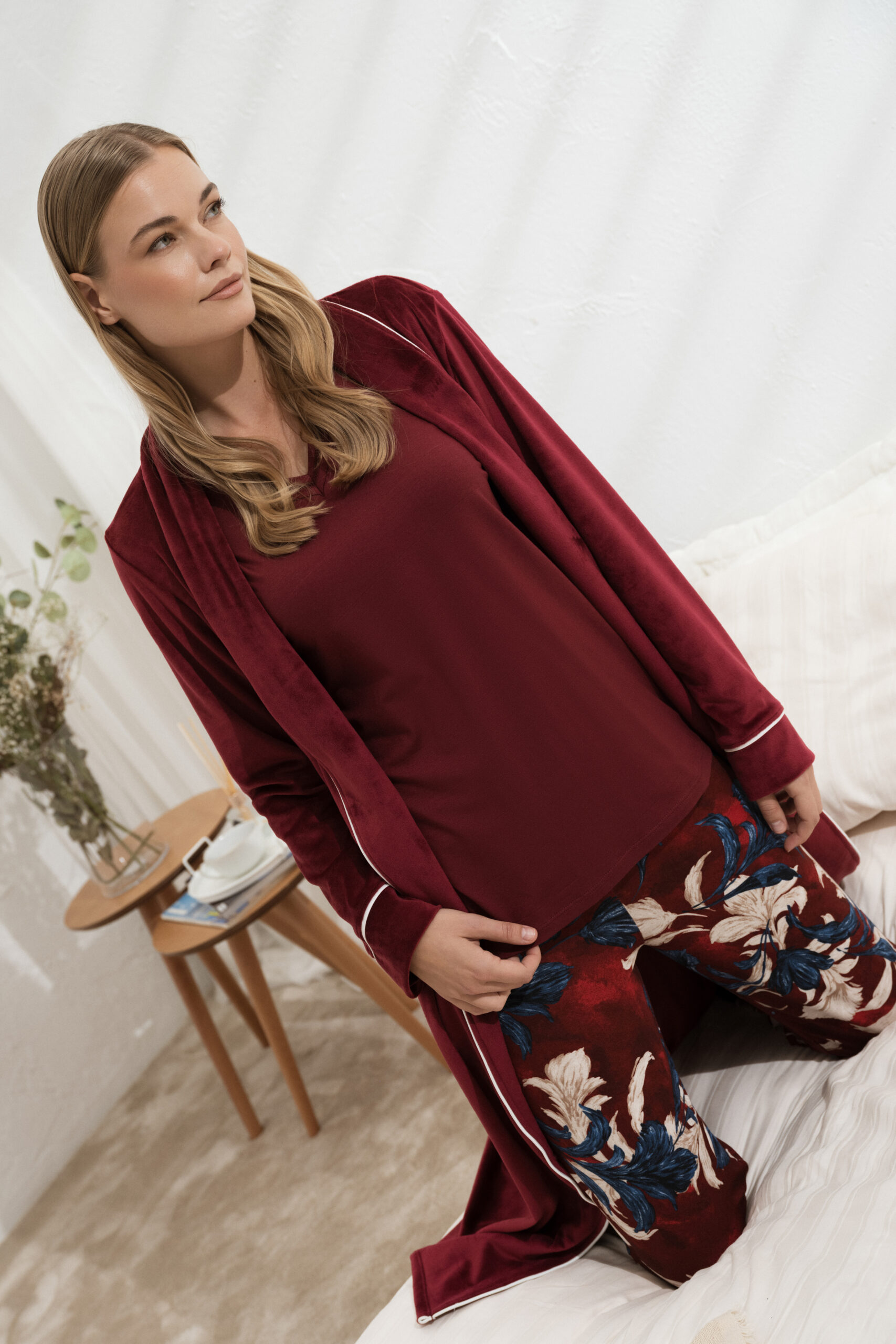 Ausgewogene gewebte und gestrickte Konstruktionen sorgen für Wärme ohne Schwere und gewährleisten höchsten Tragekomfort bei Tag und Nacht. Die Farbpalette spiegelt die Tiefe der Saison wider – warme Naturtöne, Waldgrün, satte Beerentöne, Mitternachtsblau, sanfte Graunuancen und elegante Off-White-Töne. Dezente Prints, feine Streifen, minimale Spitzendetails sowie entspannte und zugleich strukturierte Silhouetten prägen die Kollektion.